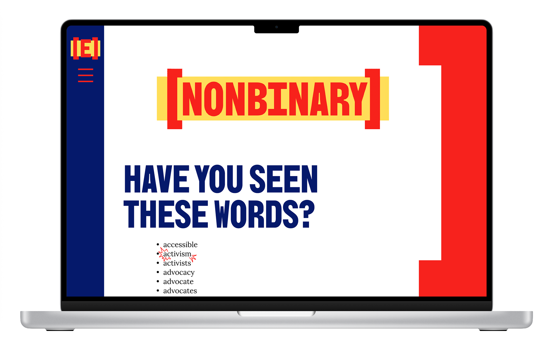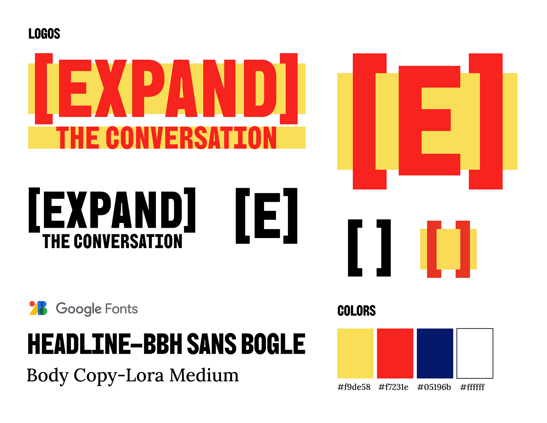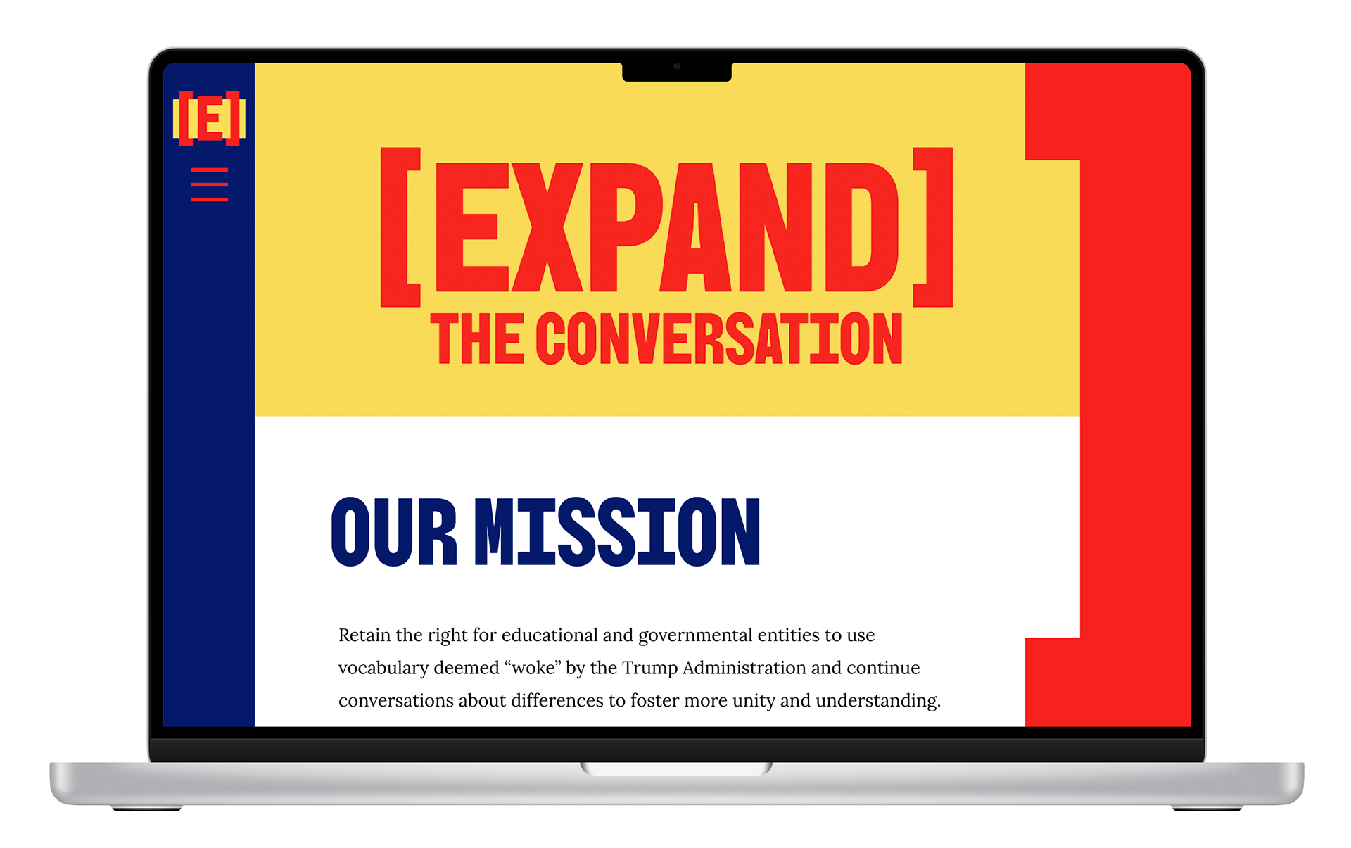 The branding for the full system uses traditional elements of type in an inventive way. Brackets are used to add or clarify information to a sentence. Putting the word Expand in brackets communicates the idea that these words need to be added back into the conversation. The yellow boxes behind the words mimic the form of the black box that is used to redact words from documents but instead it highlights the words and makes them stand out. The color scheme sticks to the traditional red, white and blue we see in the flag but adds the yellow to communicate a sense of urgency and change. For my typefaces, I chose two from Google Fonts so they could be accessible to anyone who wants to make posters, flyers, or graphics for events relating to the movement in their area.
