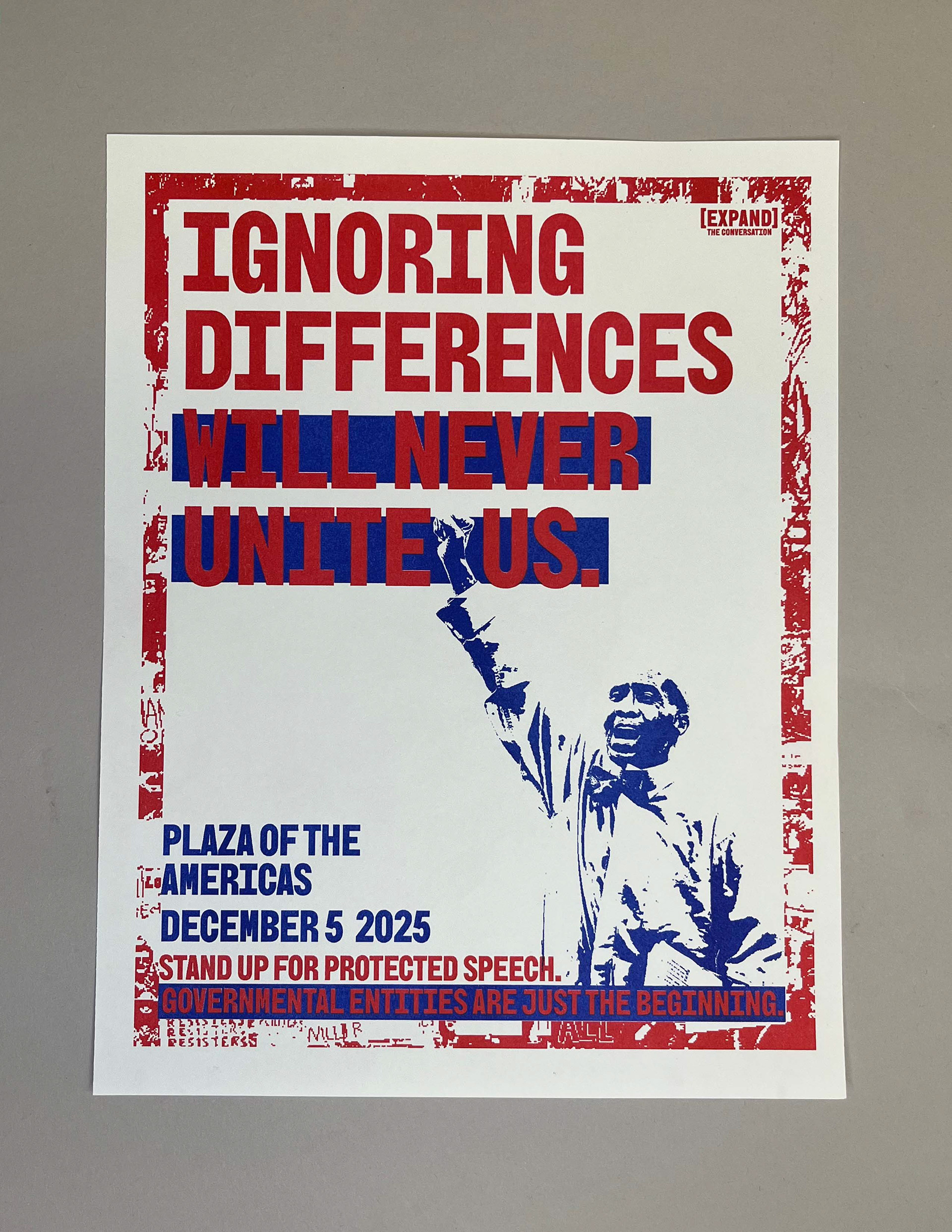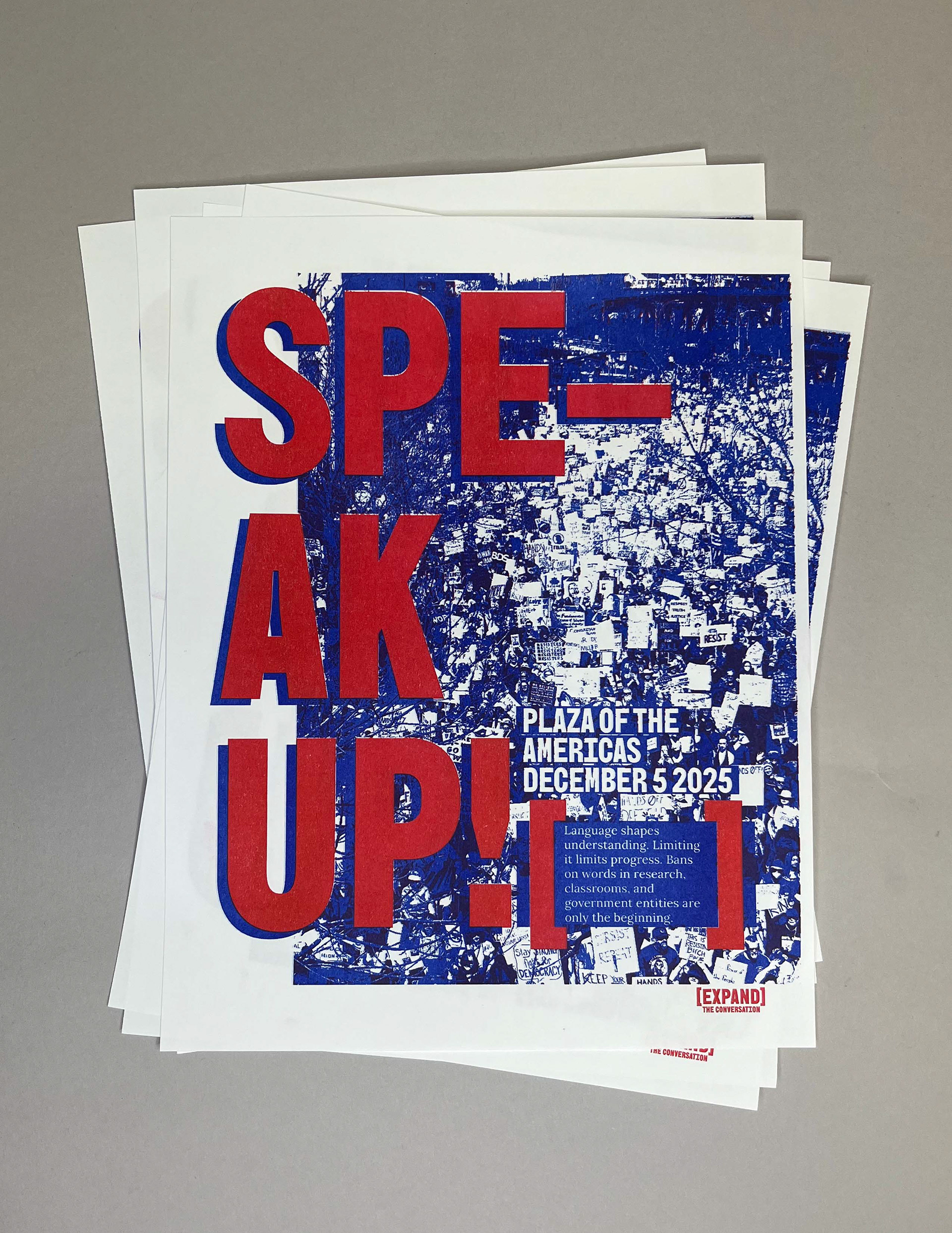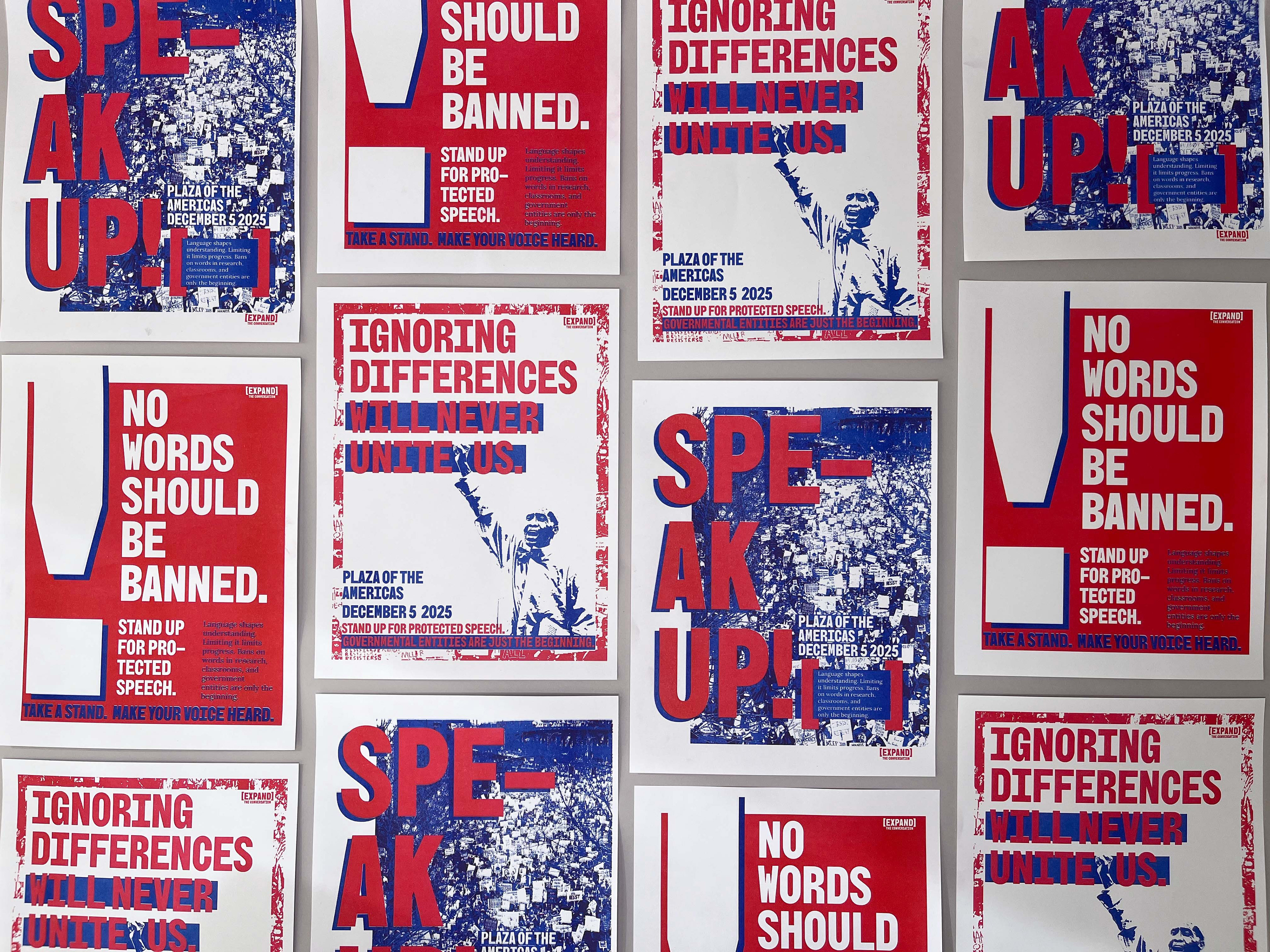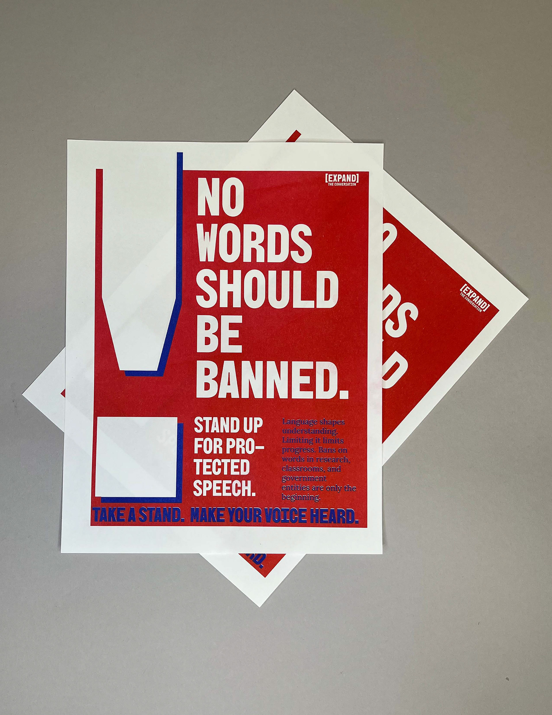 Expand the Conversation is an imagined national political movement that helps people organize through protest and political action to advocate for the unrestricted use of non-violent language controlled by the Federal Government. The Trump administration has banned a long list of words and phrases that even mention diversity, minorities or offer more inclusive language to specifically transgender and nonbinary people. In research facilities looking for federal government grants, they are not allowed to use any of these words or they will not receive funding even if these words are crucial foundations of their research. This is especially affecting research labs on college campuses.